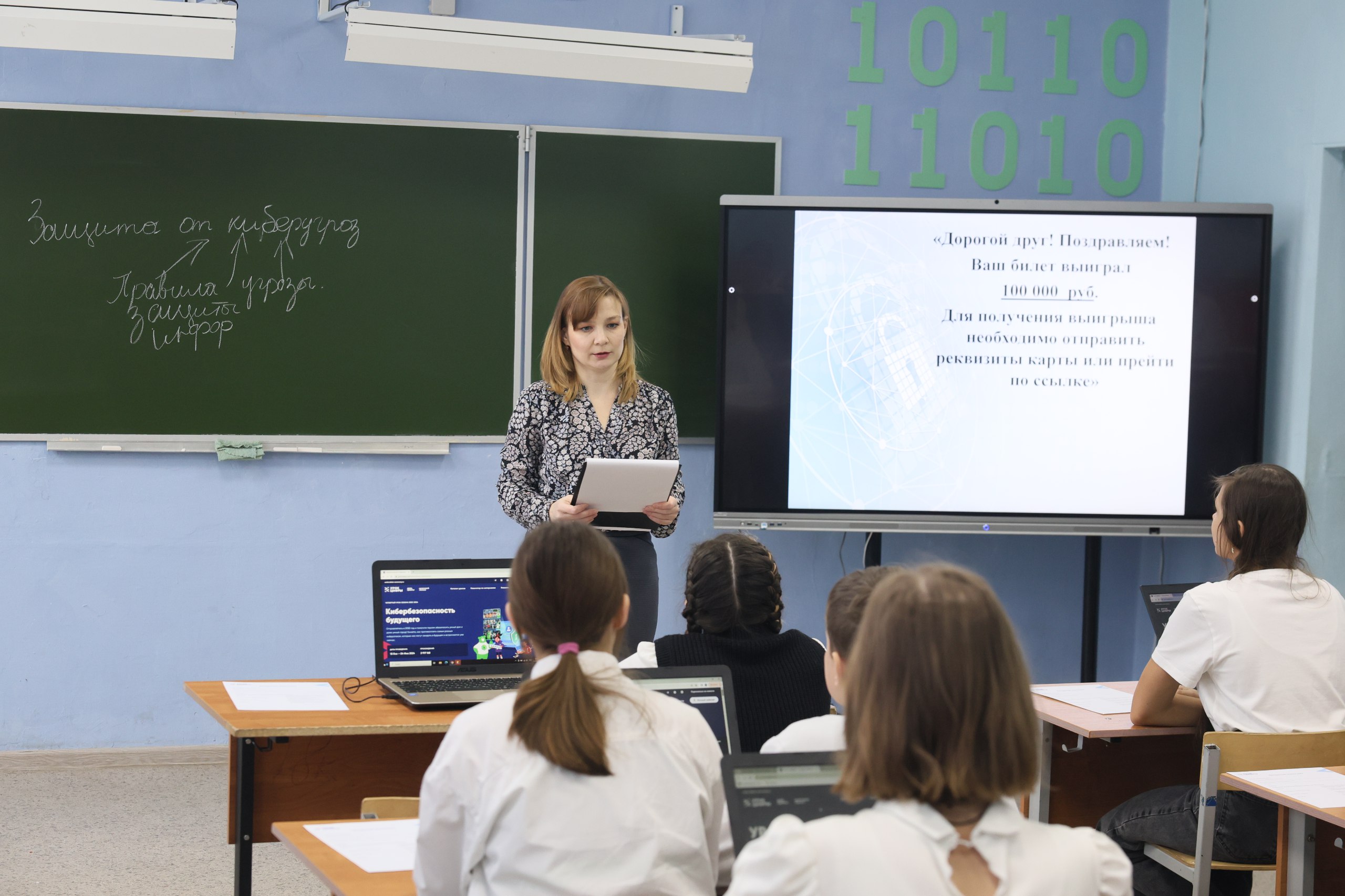 Занятие, посвященное теме кибербезопасности и защиты от мошенников в интернете, для обучающихся 7-х классов провела учитель информатики школы Валентина Курносова совместно с заведующей кафедрой информатики и информационных технологий Нижегородского института развития образования Татьяной Каняниной и техническим директором компании «Росдидактика» Олегом Шитовым.